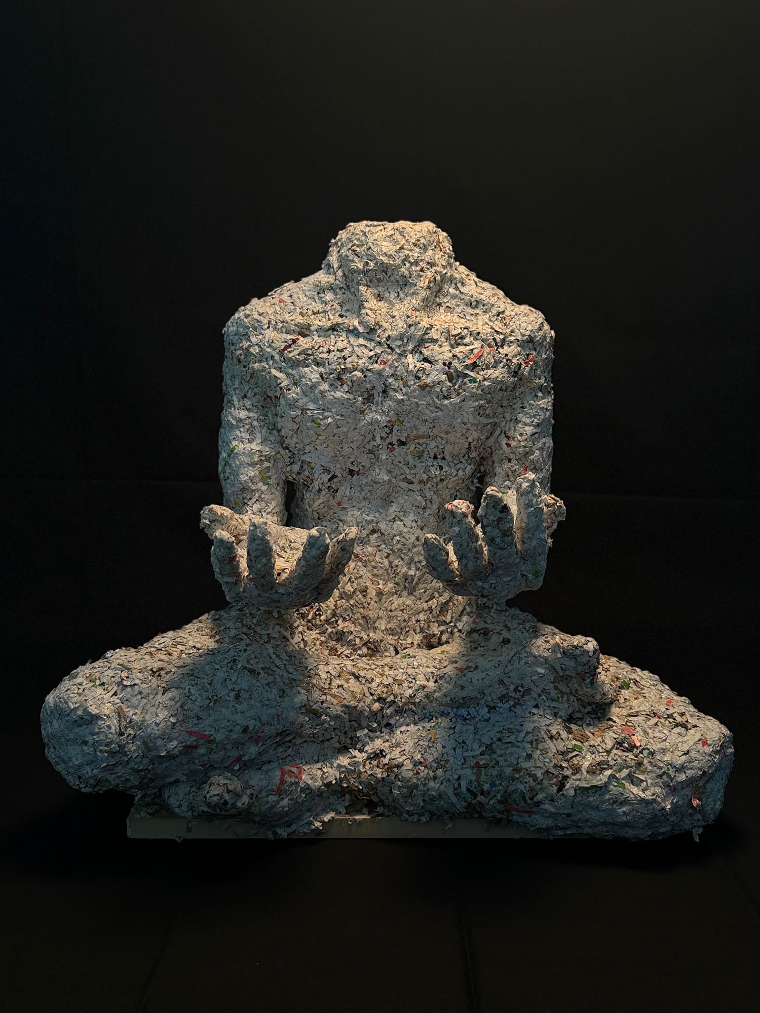高校生活で一番努力をしたことは定期テストの勉強で、中学生の頃とても成績が悪かったため高校では学年5位以内に入ることを目標にしました。そして高校2年生2学期期末テストでは学年4位にまで上り詰めることができました。しかしながらそれを超えることはありませんでした。これは勉強に限ったことではありません。労働でも人間関係でも制作でも自分の限界は必ずあります。私はその経験を形にしたいと思いました。彼の体は私の自習用ノートをシュレッダーに掛けてそれをボンドで固めたものです。そして自分の限界を知る、劣等感を感じるポイントとして頭がない造形にしました。彼はどれだけ努力をしても劣等感を感じなくなることはないのです。