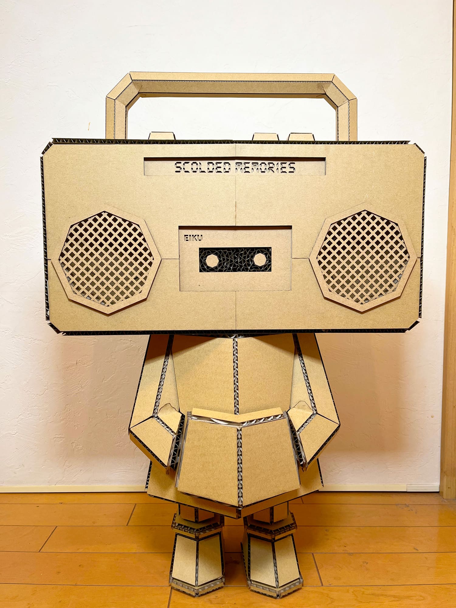 造形面では、身近なダンボールのみを使用することにこだわりました。精密な設計と丁寧なカットを積み重ね、平面から複雑な多面体へと再構築することで、脆くも捨て去ることのできない「記憶」という存在の生々しさを具現化しています。