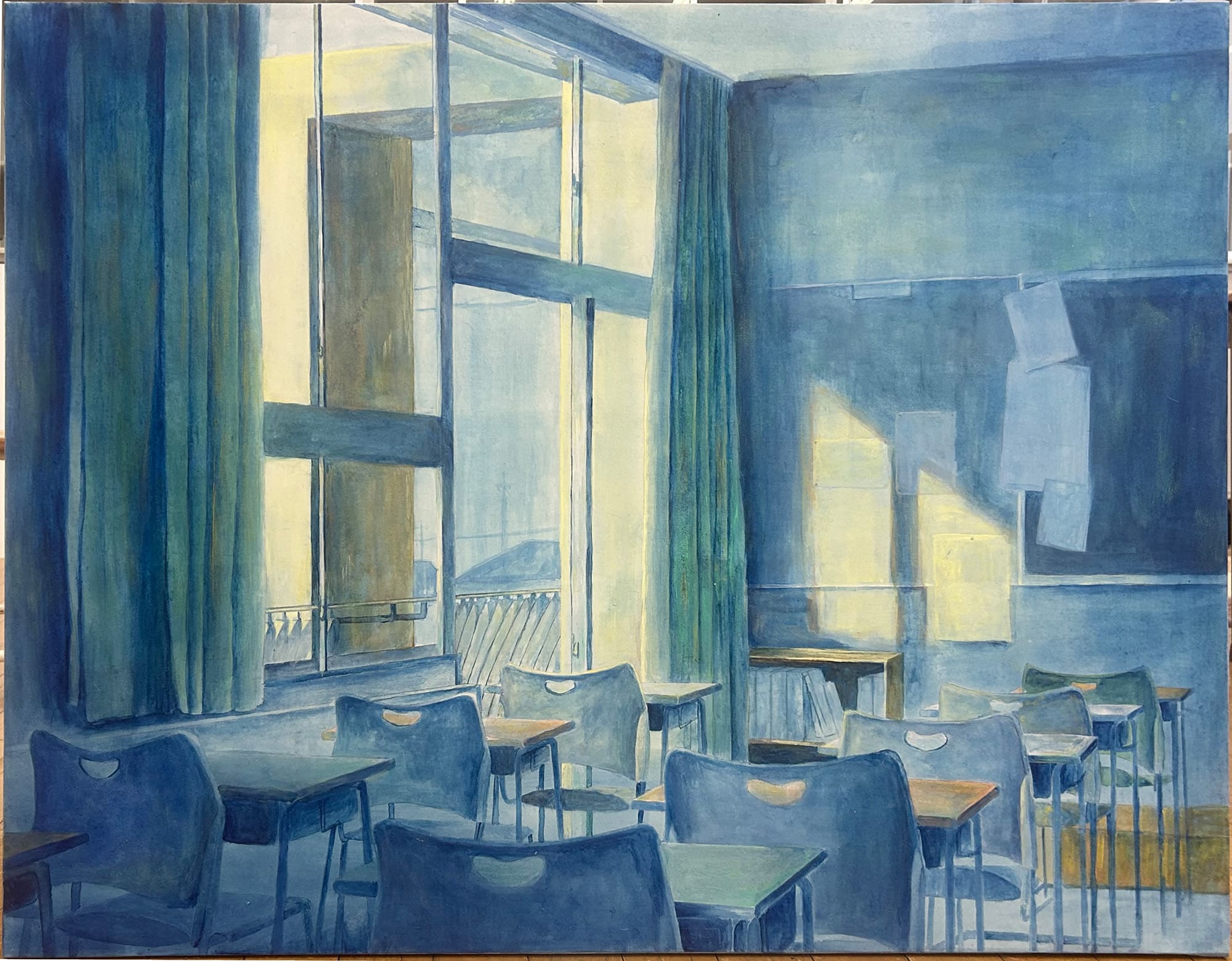 奨励賞 美術・工芸部門[絵画] 瞬間 一戸 くるみ(宮城県宮城野高等学校) 朝の教室を描きました。タイトルは朝日の差し込む瞬間の美しさ、ここの教室で過ごすたったの3年間という瞬間のような時間の美しさという意味を込めました。ゴッホの「夜のカフェテラス」に影響され影は青で光は黄色にして、写真ではできないような表現を工夫しました。